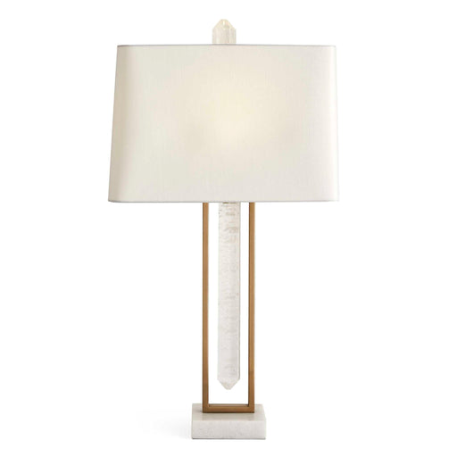 RevelationA stunning, manmade crystal quartz point floats between a metal frame finished in rich brass. The lamp has a rectangular tapered hardback faux silk...