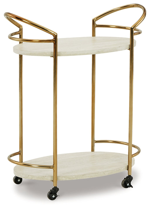 Signature Design by Ashley®Part furniture, part art form, this luxurious bar cart is stone cold perfection. Light goldtone metal frames the faux travertine shelves to create ...