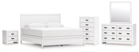 Details B427B8: Includes king panel headboard, footboard, rails and slats, Made with hardwood solids, okoume veneer and MDF substrates, White finish, Foundation/box spring required, sold separately, Mattress available, sold separately, Assembly required, B427B1: Includes dresser and mirror, Made with hardwood solids, okoume veneer and MDF substrates, White finish, 6 drawers with dovetail construction and metal center guides, Hardware with dark finish, Drawer interiors are lined with a wood grain laminate for a clean, finished look, Mirror attaches to back of dresser, B427-46: Made with hardwood solids, okoume veneer and MDF substrates, White finish, 5 drawers with dovetail construction and metal center guides, Hardware with dark finish, Drawer interiors are lined with a wood grain laminate for a clean, finished look, B427-92: Made with hardwood solids, okoume veneer and MDF substrates, White finish, 2 drawers with dovetail construction and metal center guides, Hardware with dark finish, Drawer interiors are lined with a clean wood grain laminate for a clean, finished look,