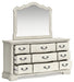 Details B980B4: Includes headboard, footboard and rails, Made with hardwood solids, spruce veneer, MDF substrates and cast resin components , Antiqued white painted finish, Polyester upholstery, Button tufting, Foundation/box spring required, sold separately, Mattress available, sold separately, Assembly required, B980B1: Includes dresser and mirror, Made with hardwood solids, spruce veneer, MDF substrates and cast resin components, Antiqued white painted finish, 9 drawers with fully finished interiors, French and English dovetail construction and ball-bearing side glides, Metal bar pulls with aged pewter-tone finish, Mirror attaches to back of dresser,