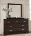 Details B441B6: Includes panel headboard, footboard, rails and slats, Made with hardwood solids, engineered wood veneer and MDF substrates, Dark brown finish, Floating panel headboard, Picture frame footboard, Foundation/box spring required, sold separately , Mattress available, sold separately, Assembly required, B441B1: Includes dresser and mirror, Made with hardwood solids, engineered wood veneer and MDF substrates, Dark brown finish, Metal bar pulls with bright nickel-tone finish, 7 smooth-gliding drawers with dovetail construction and metal center guides, Drawer interiors are lined with a wood grain laminate for a clean, finished look, Top moulding on dresser, Mirror attaches to back of dresser,