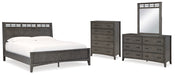 Details B651B2: Includes queen panel headboard, rails and footboard with slats , Made with hardwood solids and MDF substrates, Medium gray-brown finish with a blackened wood grain contrast; embossed wood grain texture, Lay-back headboard , Decorative inset metal grille with matte black finish , Foundation/box spring required, sold separately, Mattress not included, sold separately, Assembly required, B651B1: Includes dresser and mirror, Made with hardwood solids and MDF substrates, Medium gray-brown finish with a blackened wood grain contrast; embossed wood grain texture, Metal bar pulls with matte black finish, Inset drawers, 6 smooth-gliding drawers with fully finished interiors and metal ball-bearing side glides (top drawers felt lined), Mirror attaches to back of dresser, B651-46: Made with hardwood solids and MDF substrates, Medium gray-brown finish with a blackened wood grain contrast; embossed wood grain texture, Metal bar pulls with matte black finish, Inset drawers, 5 smooth-gliding drawers with fully finished interiors and metal ball-bearing side glides (top drawers felt lined),