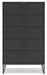 Details Made with engineered wood (MDF/particleboard/plywood) and decorative laminate for the right balance of affordability and durability, Decorative laminate replicates natural or man-made material surfaces with consistent color, pattern and texture, Matte black finish with replicated wood grain, Dark pewter-tone pulls, Metal legs with pewter-tone finish, 5 smooth-gliding drawers with vinyl-wrapped sides and back for durability, Safety is a top priority, clothing storage units are designed to meet the most, current standard for stability, ASTM F 2057 (ASTM International), Drawers extend out to accommodate maximum access to drawer interior while, maintaining safety, Assembly required