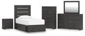 Details PCB2108B18: Includes panel headboard/footboard, 2 under bed storage units and roll slats, Made with engineered wood (MDF/particleboard/plywood) and decorative laminate for the right balance of affordability and durability , Charcoal finish over replicated oak wood grain with authentic touch, Decorative laminate replicates natural or man-made material surfaces with consistent color, pattern and texture, 4 smooth-gliding drawers, 4 storage cubbies, Bed does not require additional foundation/box spring; accommodates most zero clearance adjustable bases with the addition of a bunkie board, Mattress available, sold separately, Minor assembly required, PCB2108B1: Includes dresser and mirror, Made with engineered wood (MDF/particleboard/plywood) and decorative laminate for the right balance of affordability and durability , Charcoal finish over replicated oak grain with authentic touch, Decorative laminate replicates natural or man-made material surfaces with consistent color, pattern and texture, Large-scale dark colored handles, 6 smooth-gliding drawers, Drawer interiors are lined with a faux linen laminate for a clean, finished look , Mirror attaches to back of dresser; can also be mounted on wall horizontally or vertically, Safety is a top priority, clothing storage units are designed to meet the most current standard for stability, ASTM F 2057 (ASTM International), Drawers extend out to accommodate maximum access to drawer interior while maintaining safety, Minor assembly required, PCB2108-46: Made with engineered wood (MDF/particleboard/plywood) and decorative laminate for the right balance of affordability and durability, Charcoal finish over replicated oak grain with authentic touch, Decorative laminate replicates natural or man-made material surfaces with consistent color, pattern and texture, Large-scale dark colored handles, 5 smooth-gliding drawers, Drawer interiors are lined with a faux linen laminate for a clean, finished look, Safety is a top priority, clothing storage units are designed to meet the most current standard for stability, ASTM F 2057 (ASTM International), Drawers extend out to accommodate maximum access to drawer interior while maintaining safety, Minor assembly required, PCB2108-92: Made with engineered wood (MDF/particleboard/plywood) and decorative laminate for the right balance of affordability and durability, Charcoal finish over replicated oak grain with authentic touch, Decorative laminate replicates natural or man-made material surfaces with consistent color, pattern and texture, Large-scale dark colored handles, 2 smooth-gliding drawers, Drawer interiors are lined with a faux linen laminate for a clean, finished look, 2 slim-profile USB-C charging ports, Power cord included; UL Listed, Minor assembly required,