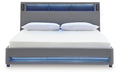 Snooze in style with this king upholstered bed. It brings delightful function to winding down before bedtime, with an adjustable LED reading light on each side. And for added flair, multicolored ambient lighting brings an ultra-cool vibe to the overall look. Combining modern convenience with captivating design, this bed revamps your restful retreat like never before.