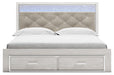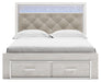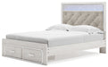The epitome of fashion-forward design, this queen upholstered storage bed is a beautiful blend of comfort and luxury. Shiny chrome-tone accents, a pearlized finish and button-tufted upholstery bring a glam touch to the richly rustic appearance. Remote-controlled LED lighting adds style and modern convenience to your restful retreat.