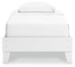 Details | Twin platform bed (does not include headboard), Made with engineered wood (MDF/particleboard/plywood) and decorative laminate for the right balance of affordability and durability, Decorative laminate replicates natural or man-made material surfaces with consistent color, pattern and texture, Matte white finish, Bed does not require additional foundation/box spring; accommodates most zero clearance adjustable bases, Mattress available, sold separately, Assembly required | |
