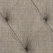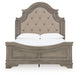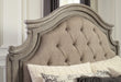Cottage quaint styling and quality construction make this queen panel bed a dream come true. An antiqued gray finish and beige upholstery provide rustic warmth. The ornately shaped headboard marries classic design with homey charm for an elegant bedroom must-have.
