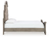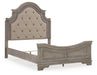 Details | Includes queen panel headboard, footboard and rails, Made with acacia wood, birch and acacia veneers, engineered wood and cast resin components, Antiqued gray finish, Ornately shaped headboard with inset upholstered cushion, Foundation/box spring required, sold separately, Mattress not included, sold separately, Assembly required | |