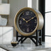 Clock Face Features A Metal Frame With A Brass Finish And Aged Black Stand. Quartz Movement Ensures Accurate Timekeeping. Requires One "AA" Battery.