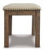 This upholstered dining bench elevates the art of casual rustic style. With a distressed nutmeg finish, antiqued nailhead trim and textured polyester fabric, this upholstered dining bench entices with warmth and earthy elegance. Cushioned seat accommodates lingering meals enjoyed in comfort.