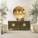 Featuring a beautiful finish, this console has been inspired by the legendary palatial entrances. The rich details never end. Two pairs of doors center around custom solid brass pulls on gleaming medallion, backplate and feet are the perfect complement to panels of olive ash burl and quartered oak. Inside, generous storage space keeps things orderly with one adjustable shelf and wire management.