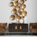 Doors of Italian smoke eucalyptus and polished brass insets in variations of hexagonal patterns set in a cabinet with a unique butterfly shape. Featuring tapered brass finished legs and dramatic overscale pulls, this cabinet will be the focal point of any room. Behind each of the two bi-fold doors there is one adjustable shelf with access for electrical wiring.