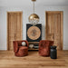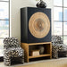 Reminiscent of mid 20th century sculptures that interpreted Mayan carvings of the sun, the Soleil Bar Cabinet is a functional work of art. Natural finished wood carving and quartered American white oak interior contrasts with the black case surface finish. The stunning hand carved doors feature a variety of intriguing textures. The interior houses a six-row wine rack, eight-bottle holder, adjustable glass shelf, open storage, two tailored drawers for bar tools, LED lighting on a touch-controlled dimmer switch and a reflective mirrored back. The base is made of natural quartered oak and has one shelf.