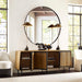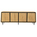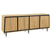 Wrapped in seamless rift-cut oak, this console follows moderne lines, complete with a tapered profile and rounded corners. Four hand-carved doors appear to float, an illusion created by a black recessed frame. Finger pulls open to solid oak construction and finished interior. Matte black metal legs mimic tapered lily pad columns originated by Frank Lloyd Wright for his iconic Johnson Wax Headquarters.