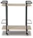 Details | Made with engineered wood and melamine laminate, Light natural wood grain effect, MEGA-TUFF® melamine surfaces are made of easy-clean melamine which is heat-, scratch-, water- and stain-resistant, Metal frame with black finish, 2 shelves, 2 bottle holders, Locking casters, Assembly required | |