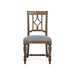 Designed to complement our Plymouth dining tables with a coordinating cottage look, this charming dining chair features an appealing open back design with a diamond-shaped detail, intricately carved trestles and turned legs for added vintage character. Available in a distressed medium brown finish, each chair is upholstered in a durable and cleanable coordinating fabric, providing comfort for long periods of sitting.