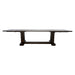 A grand extension table designed entirely in straight lines. Featuring a veneer top finished in a black brushed oak finish with white ceruse, removeable breadboard extension leaves, and solid wood balusters carved into stacked blocks. Two 18" leaves can extend the table to 132".