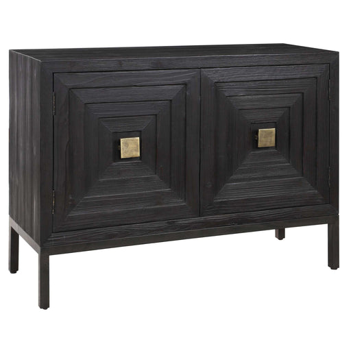 UttermostA Contemporary Geometric Two Door Accent Cabinet, Constructed From Deeply Grained Fir Wood Finished In A Dark Ebony Stain, Accented With Brushed Br...