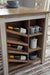 Details D394-32: Made of solid wood, engineered wood and acacia veneers, Two-tone finish, 2 shelves, 8-bottle wine rack, Seats up to 4, Assembly required, D394-124: Made of solid wood, Distressed grayish white finish, Cushioned seat with polyester upholstery, Assembly required,