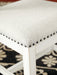 Details | D546-35: Made of pine wood, veneer and engineered wood, Two-tone finish, Black metal accents, Table extends by pulling both ends and dropping in leaf, Seats up to 8 fully extended, Assembly required, D546-01: Made of solid wood, Distressed vintage white finish with linen colored polyester upholstery, Nailhead trim, Cushioned seat, Assembly required, | |