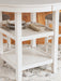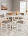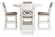 Details | Includes counter height dining table and 4 counter height bar stools, Table made with rubberwood solids, mindi veneer and MDF substrates, Bar stool made with solid wood frame and engineered wood, White finish, Light gray textured polyester upholstery, Foam seat and back cushions, Backrest with fretwork accent, Bar stool with adjustable levelers; footrest for added support, Table includes 2 display shelves, Seats up to 4, Tapered legs, Assembly required | |