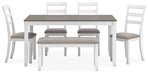 Details | Includes dining table, bench and 4 chairs, Made with hardwood solids, veneer and MDF substrate, Clean white finish, Table top with gray wood-tone finish, Polyester upholstery, Foam cushioned seats, Assembly required | |