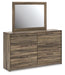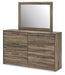Details Includes dresser and mirror, Made with engineered wood (MDF/particleboard/plywood) and decorative laminate for the right balance of affordability and durability, Weathered brown finish over replicated oak grain with authentic touch, Decorative laminate replicates natural or man-made material surfaces with consistent color, pattern and texture , Linear pulls with antiqued gunmetal finish, 6 smooth-gliding drawers, Drawer interiors are lined with a faux linen laminate for a clean, finished look, Mirror attaches to back of dresser; can also be mounted on wall horizontally or vertically , Safety is a top priority, clothing storage units are designed to meet the most current standard for stability, ASTM F 2057 (ASTM International), Drawers extend out to accommodate maximum access to drawer interior while maintaining safety, Assembly required