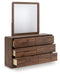 Details | Includes dresser and mirror, Made with MDF substrates and decorative paper laminate, Replicated walnut wood grain with high-low contrast for a rich brown wood tone, Hardware with black finish, 6 smooth-gliding drawers with English dovetail construction and center mount drawer guides (top drawers felt lined), Drawer interiors lined with decorative wood grain paper laminate, Mirror attaches to back of dresser | |