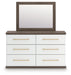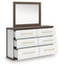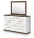 Details Includes dresser and mirror, Made with engineered wood (MDF/particleboard/plywood) and decorative laminate for the right balance of affordability and durability, Dresser with two-tone finish (dark brown finish over replicated walnut grain; matte white finish) , Mirror with dark brown finish over replicated walnut grain, Decorative laminate replicates natural or man-made material surfaces with consistent color, pattern and texture, Handles with champagne finish, 6 smooth-gliding drawers, Drawer interiors are lined with a faux linen laminate for a clean, finished look, Safety is a top priority, clothing storage units are designed to meet the most current standard for stability, ASTM F 2057 (ASTM International), Drawers extend out to accommodate maximum access to drawer interior while maintaining safety, Mirror attaches to back of dresser; can also be mounted on wall horizontally or vertically, Minor assembly required