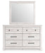 Details Includes dresser and mirror, Made with engineered wood (MDF/particleboard/plywood) and decorative laminate for the right balance of affordability and durability, Whitewash replicated worn through paint over replicated wood grain with authentic touch, Decorative laminate replicates natural or man-made material surfaces with consistent color, pattern and texture, Hardware with dark bronze-tone finish, 6 smooth-gliding drawers, Mirror attaches to back of dresser; can also be mounted on wall vertically, Safety is a top priority, clothing storage units are designed to meet the most current standard for stability, ASTM F 2057 (ASTM International), Drawers extend out to accommodate maximum access to drawer interior while maintaining safety, Minor assembly required