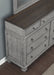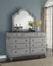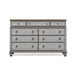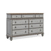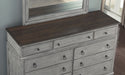 Perfectly complementing our various Plymouth bed styles, this cottage-inspired dresser supports your every storage need. Ample storage is provided with nine spacious, easy-to-open drawers accented by contrasting gunmetal pulls. Felt-lined top drawers and cedar-lined bottom drawers protect delicate items and clothing from damage and pests, while a convenient drawer with false bottom conceals valuables. A weathered graywash finish with contrasting medium brown top, paneled accents and turned bun feet add to the charming vintage appeal. Complete the look with an optional coordinating beveled mirror.