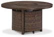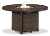 Details | 48" round fire pit with CSA-approved 55,000 BTU stainless steel burner, glass beads, burner cover and protective all-weather cover, All-weather, handwoven resin wicker over rust-free aluminum frame, Aluminum wood-look top, Door conceals gas propane tank (not included), Convertible to natural gas, Battery-operated ignition system with adjustable flame control; battery included, Gas line or propane tank connector hose not provided, Assembly required | |