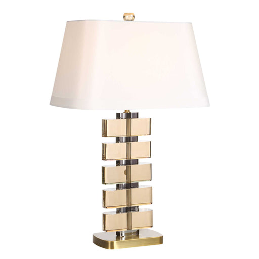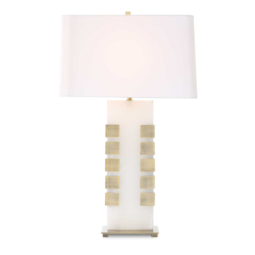 RevelationA white alabaster monolith is accented with wrapped antique brass-finished steel clamps base and finial. The rectangular hardback tapered shade has...
