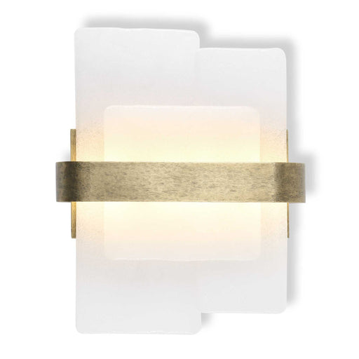 RevelationSoft rectangles of thick opaline bubble glass glow, while floating and overlapping, illuminated by LED light. The light antique brass finish band h...