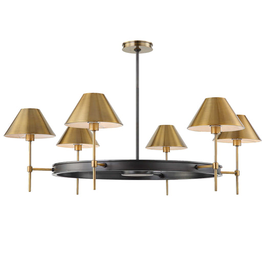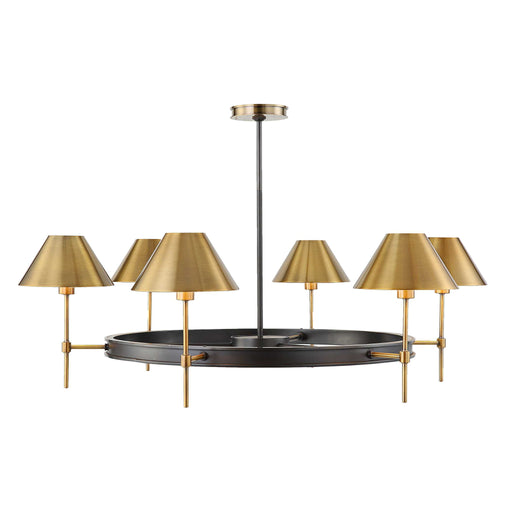 Original price $1,529.99 - Original price $1,529.99Original price$1,529.99$1,529.99 - $1,529.99Current price $1,529.99Streamline - 6 Light Chandelier - Brass / BronzeRevelationA dark bronze finish steel wheel suspends six extended metal, light antique brass finish torches and shades. The tapered shades have a white interi... View full details