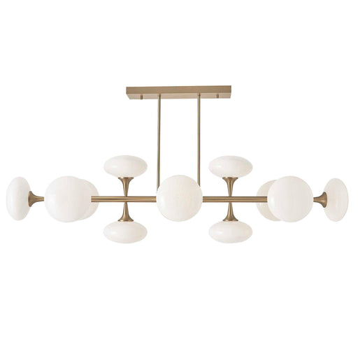 RevelationTwo sizes of opaline swirl art glass spheres sprout from 14 organic and asymmetrically arranged branches in a light antique brass finish, creating ...