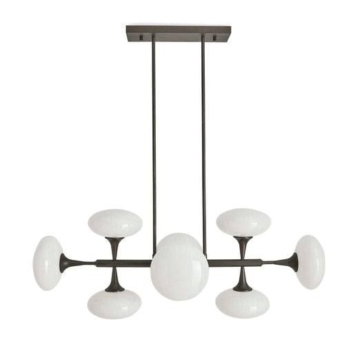 RevelationWhite art glass shades with jewel-like bubbles are reminiscent of droplets of water. They are attached from bronze-finished tapered caps suspended ...