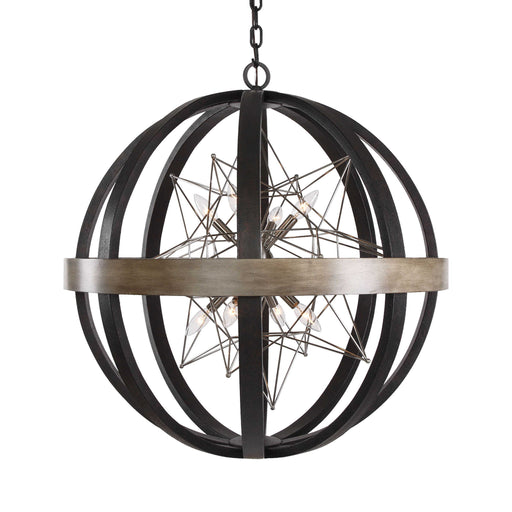 RevelationLarge transitional statement orb in distressed textured bronze featuring a stained washed wood center band, all surrounding an interior brushed nic...