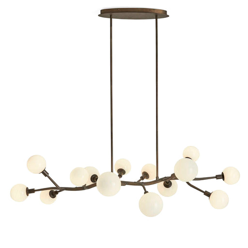 RevelationTwo sizes of opaline swirl art glass spheres sprout from 14 organic and asymmetrically arranged branches in a light antique brass finish, creating ...