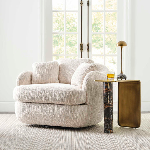 RevelationA rich, mocha-colored Michelangelo marble base has natural gold and white veining and a metal plate and feet in a light antique brass finish. A 90-...