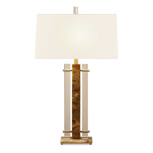 RevelationThe Triplex Lamp showcases two columns of champagne crystal flanking a column of latte onyx. The base of honey onyx, rests on a metal plate with fe...