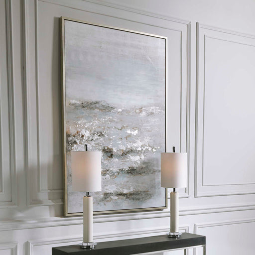 Original price $879.99 - Original price $879.99Original price$879.99$879.99 - $879.99Current price $879.99Lakeside Grande - Framed Abstract Print - Pearl SilverUttermostHand Painted On A Metal Sheet, This Contemporary Artwork Features Shades Of Silver Leaf, Blue-green And White. Each Piece Is Placed Under Glass In ... View full details