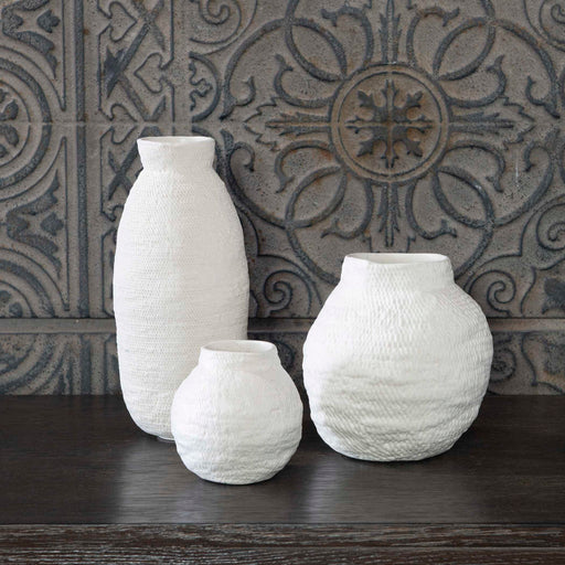 RevelationRich in texture and detail, these ceramic vases were molded from an authentic wicker basket. Subtle matte white pumice glaze enhances the texture a...