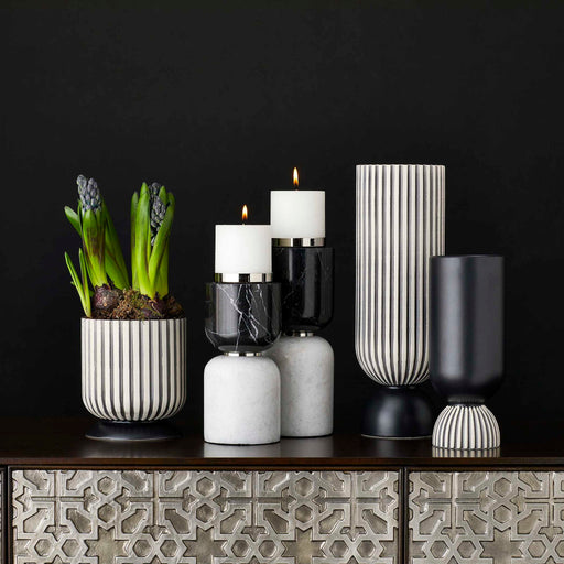RevelationThe Channeled Vase design draws inspiration from classic roman and art deco designs. Made of ceramic and decorated in matte black and white glaze.S...