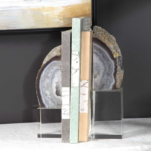 RevelationSet of two bookends feature thick, gray marble with raw unfinished edges set atop clear crystal cube bases. Sizes: Sm-4x11x4, Lg-4x13x4Product Feat...