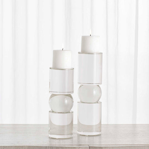 RevelationThe Luminous Pillar Holders are made of optic crystal. Clean round columns are punctuated with soft globes. Holds a 3" diameter candle. Two, 3x3 wh...