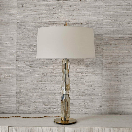 RevelationThis lamp is a gem. Resting atop an antique brass plinth sits an optic crystal in a champagne finish. Its abstract facets refract light for additio...