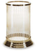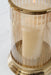 Details | Made with metal and light amber carved glass, Brass-tone finish, Holds 1 pillar candle up to 3" (not included) | |