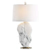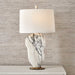 Carved from Italian Arabescato marble with sensuous lines and soft rounded edges, the Amulet Lamp has a self-trimmed oval hardback fabric shade and an organic-shaped light antique brass base.